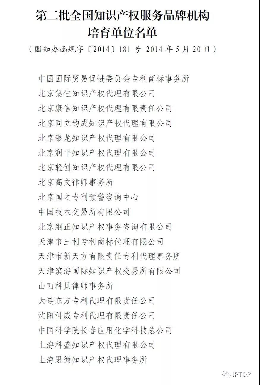 第四批全国知识产权服务品牌培育机构名单