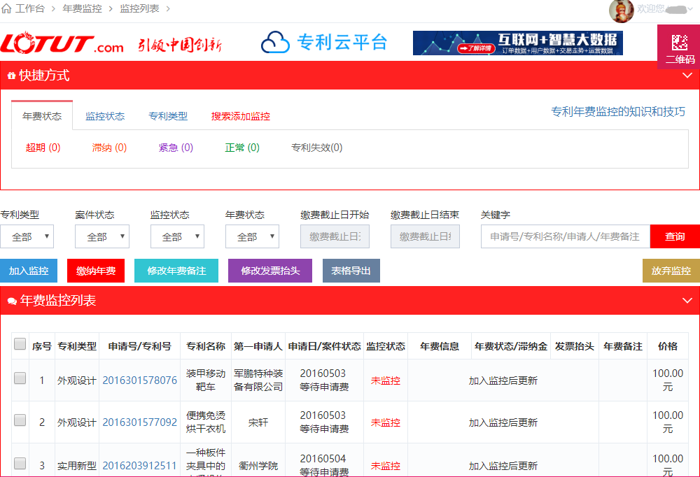 买专利卖专利找龙图腾,真高效! 查专利查商标用IPTOP,全免费!专利年费监控用IP管家,真方便! 点击监控列表,进入监控列表页面。