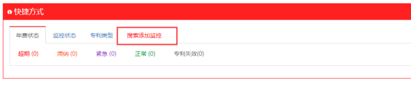 1.1 快捷处理 在监控列表页面,可以通过快捷方式栏查看各年费状态、各监控状态、各专利类型的专利数量,点击具体状态即可查看相关专利信息。 1.2 快捷方式 在监控列表页面,可以通过点击快捷方式栏中的搜索添加监控,跳转至搜索添加监控页面。 ![]()
