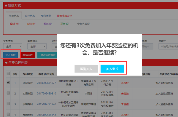 在搜索结果页面,选择专利,点击一键加入监控按钮。免费条数使用完毕,页面提示是否付费将专利加入年费监控中。