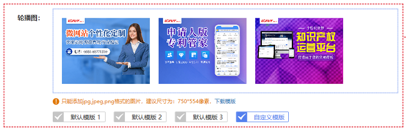具体操作: A. 设置微网站首页轮播图,可以直接选择模板作为首页轮播图片,也可以自定义上传图片,如下图: