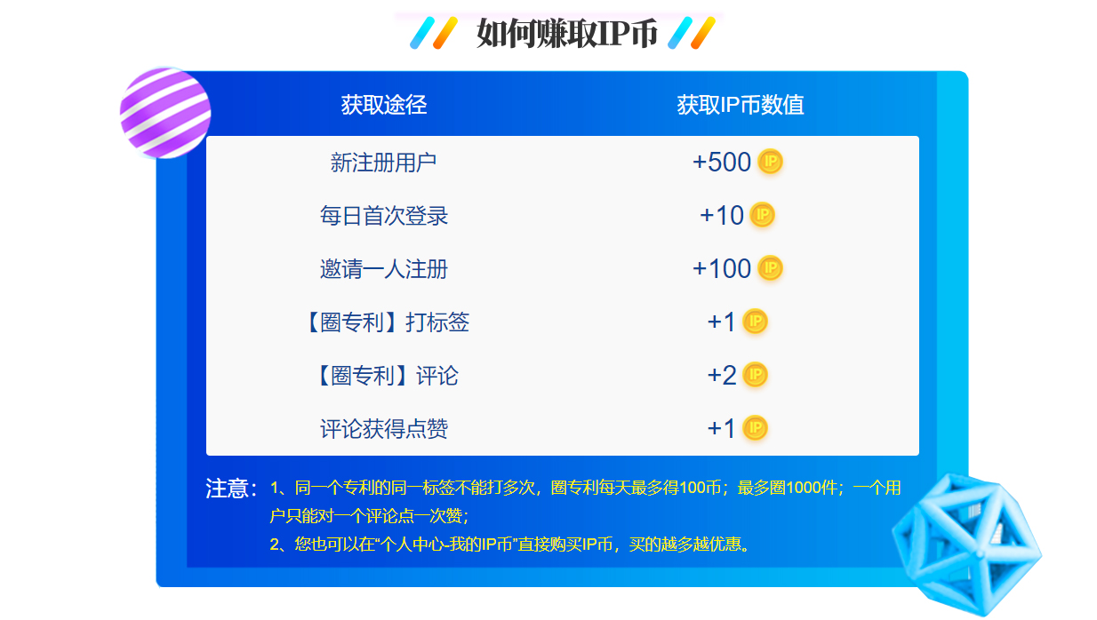 3.想要下载的专利数据太多,积分不够用怎么办?!下图为您详细介绍如何赚取更多IP币方式。更多IP币获取、消费方式,请戳链接:https://www.ip.top/ipRules