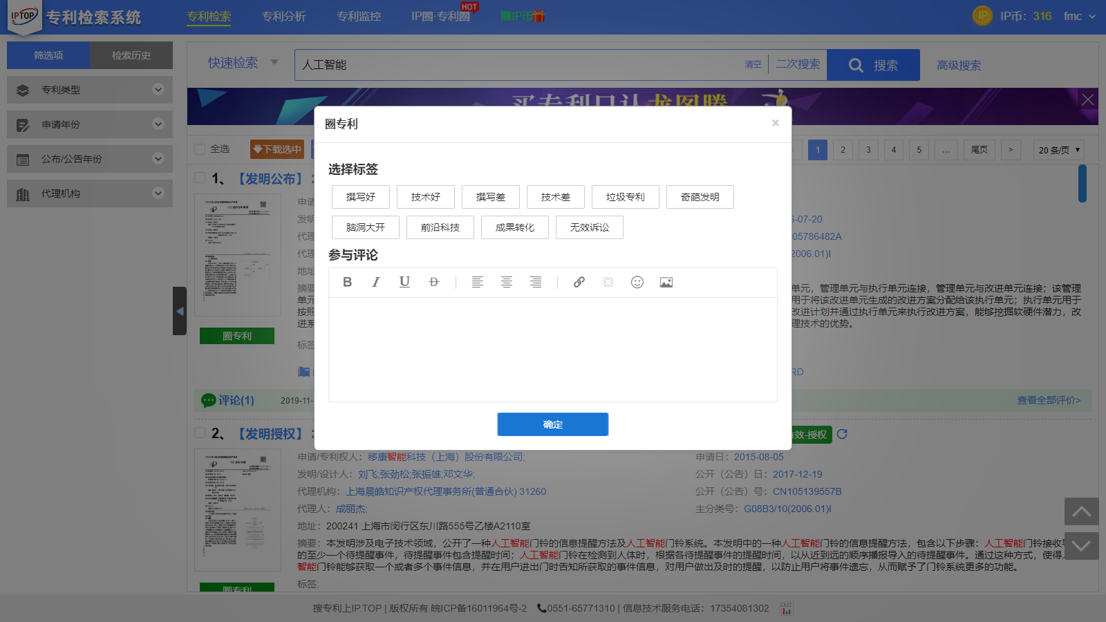 专利IP圈·专利圈是IPTOP专利检索平台本年度推出的重点功能之一,点击“圈专利”按钮,即可进入下图界面,在这里你可以畅所欲言,分享你的想法、意见、观点;给专利打标签、评论、点赞等更多新鲜好玩的圈专利方式,尽在IPTOP专利检索平台,快来圈一个呗~~~