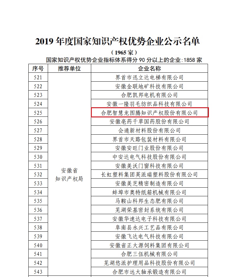 买专利卖专利找龙图腾,真高效! 查专利查商标用IPTOP,全免费!专利年费监控用IP管家,真方便! 近日,国家知识产权局网站发布最新通知,公示2019年度国家知识产权优势企业。经过层层筛选和严格评审,龙图腾指标体系得分超90分,被评为2019年度国家知识产权优势企业!
