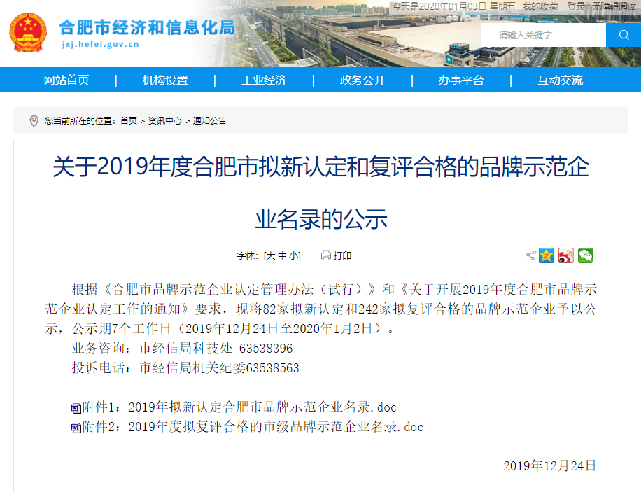 合肥智慧龙图腾知识产权股份有限公司被认定为 合肥市品牌示范企业公示文件