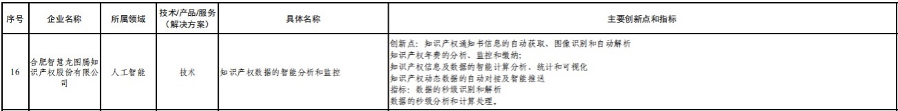 本批次合肥智慧龙图腾知识产权股份有限公司的知识产权数据的智能分析和监控平台作为人工智能项目入选。