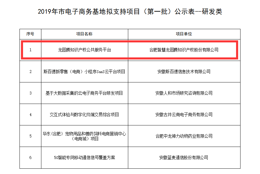 5月26日,蜀山区电子商务战略性新兴产业集聚发展基地建设工作领导小组办公室公示了2019年合肥市蜀山区电子商务产业集聚发展基地专项资金拟支持项目(第一批),龙图腾榜上有名!这不仅是对龙图腾知识产权公共服务平台的支持和肯定,也为龙图腾今后在知识产权电子商务领域持续发展,提供了强大的动力和信心。