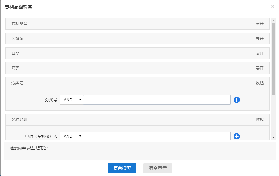 下拉滚动条,可以进一步的看到更多的界面,具体如下: 我们可以看出,专利高级检索里面包括了关键词检索、日期检索、号码检索、分类号检索以及名称地址检索,可以说是非常齐全了,能够满足专利行业的所有检索需求。