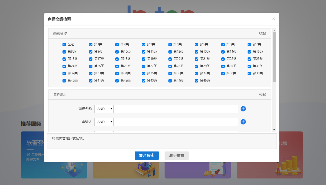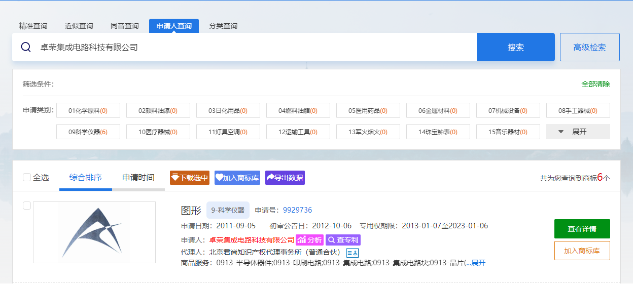 通过上图我们可以看出,商标高级检索里面我们可以先筛选商标的类别,然后根据名称、地址或者各种日期来对想要查询的商标进行检索,真的是非常方便。