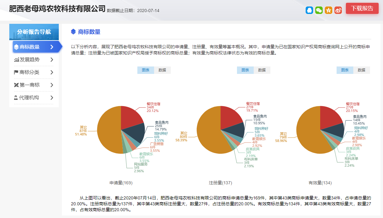 可以看到,原来是对该专利的专利权人所有的商标权数据进行了分析,也是非常nice的一个功能。 接下来,我们再回到龙图腾IPTOP的首页试试商标查询功能,我们以“老乡鸡”为例进行查询,结果如下: