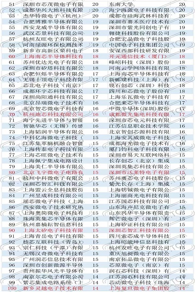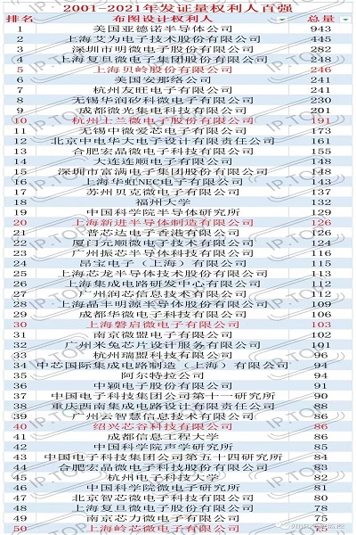 截止至2021年12月31日,通过龙图腾IPTOP知识产权平台的集成电路栏目进行数据分析得到:累计发证量排名前五的权利人依次为:1、美国亚德诺半导体公司943件,2、上海艾为电子技术股份有限公司445件,3、深圳市明微电子股份有限公司282件、4、上海复旦微电子集团股份有限公司248件,5、上海贝岭股份有限公司246件;其中第1名美国公司的登记量接近第2-4名我国公司的总和,可见我国集成电路实力较发达国家仍有很大差距;前100名的发证数据如下图所示。