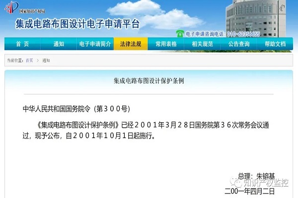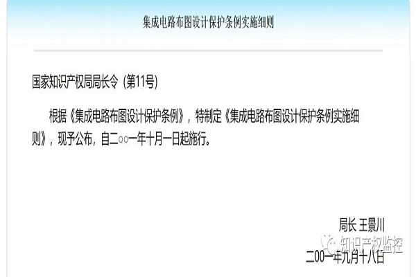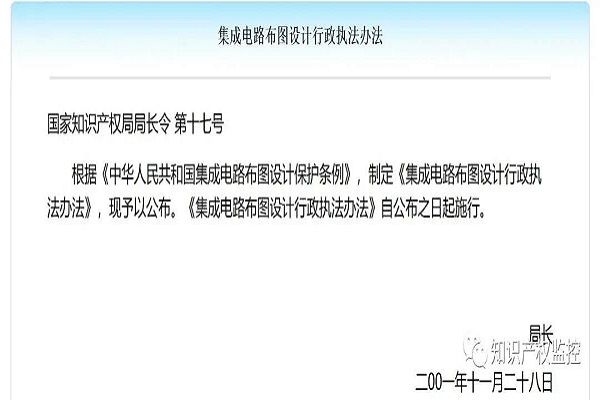 我国《集成电路布图设计保护条例》于2001年3月28日国务院第36次常务会议通过,自2001年10月1日起施行。根据《集成电路布图设计保护条例》制定的《集成电路布图设计保护条例实施细则》,自2001年10月1日起施行。根据《集成电路布图设计保护条例》,制定的《集成电路布图设计行政执法办法》,现予以公布。《集成电路布图设计行政执法办法》自2001年11月28日起施行。
